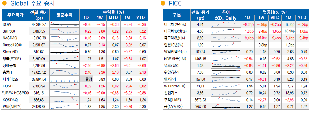 미 국채 금리는 2Y 4.24%(-0.2bp), 10Y 4.56%(-1.0bp)로 하락 마감. 장기물 금리를 중심으로 장중 4.6%(10Y)를 터치하는 등 높은 변동성 보였으나 GDP 전망 하향조정 등을 반영하며 상승폭 축소. 유가는 WTI 기준 +1.9% 상승한 $73.1 로 중국 시진핑 주석의 신년연설에 따른 경기 부양책 기대감을 반영. 달러 인덱스는 급등하며 109pt 를 상회. 다만 금 역시도 +1.3%가량 상승했는데 이는 트럼프발 대내외적 불확실성을 경계함에 따른 안전자산 선호