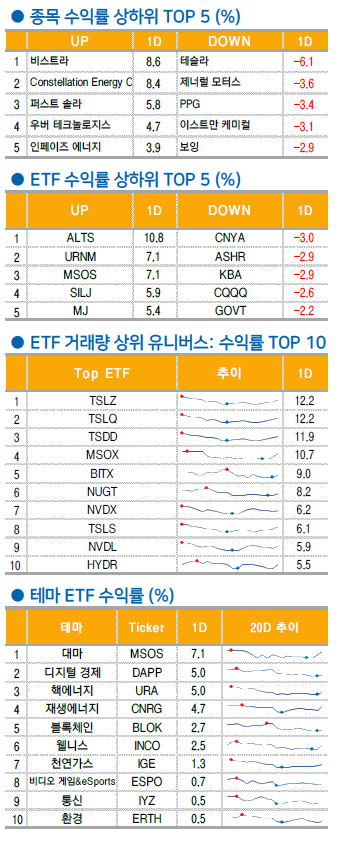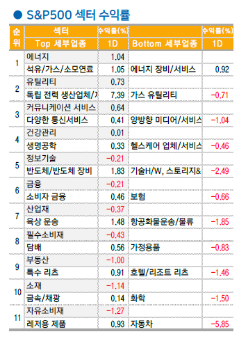 해당 변화에 엔비디아는 금일 고점대비(현지 기준 오후 12 시경) -2.5%가량 급락이후 10 년물 금리가 4.6%수준에서 4.56%로 하락하며 하방 압력이 일부 완화되었음에도 일부 종목(엔비디아 등)을 제외하면 회복에 실패하며 미 증시는 5 거래일 연속 하락 마감.11 개 섹터 중 유가 상승을 반영한 에너지(+1.0%), 유틸리티(+0.7%)와 컴스, 건강관리 등 4 개 섹터 상승 마감.