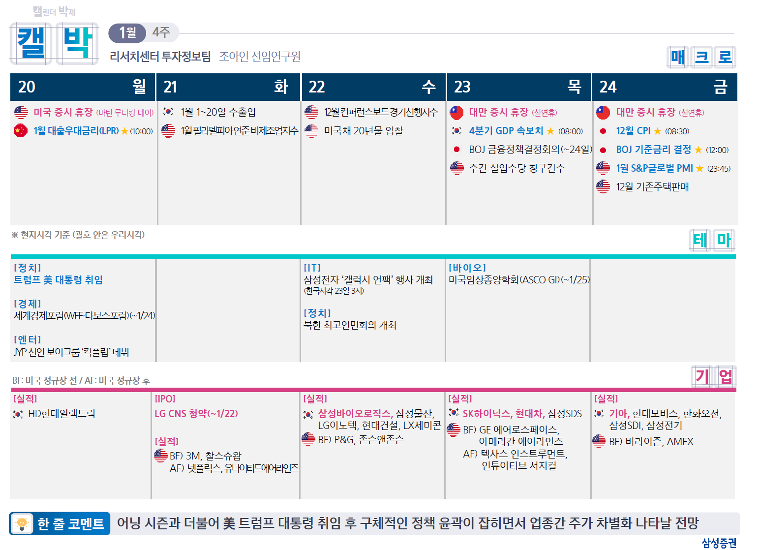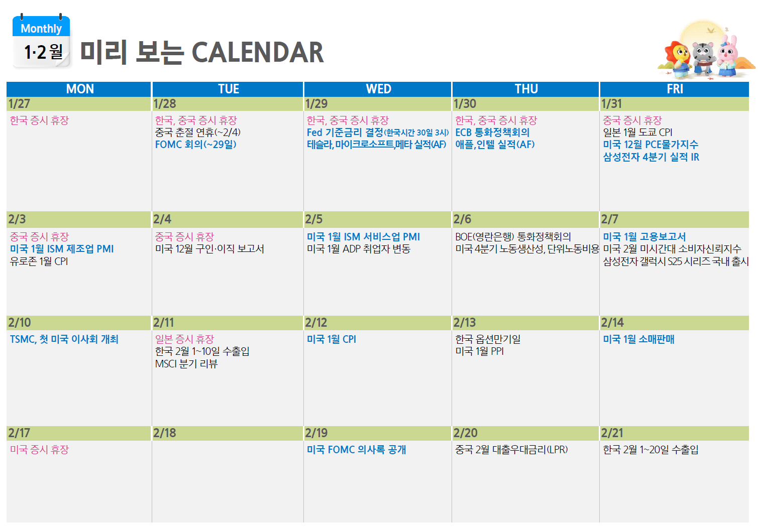 시장의 화두는 트럼프 2.0이였고 행정명령 발표, 관세 부과 이슈, 그리고 개별 종목군에 대한 변화 요인에 등락. 특히 트럼프가 캐나다와 멕시코에는 2월에 관세를 부과한다고 언급했지만, 시장이 가장 우려했던 보편적 관세에 대해 준비가 안되어 있다고 언급하자 달러화가 약세를 확대한 점이 투자심리에 긍정적. 여기에 트럼프의 중국 방문, 중국도 무역 전쟁에서 승자는 없겠지만, 더 많은 제품을 수입할 것이라고 발표한 점도 우려보다는 긍정적인 평가에 더 주목하게 만든 요인
