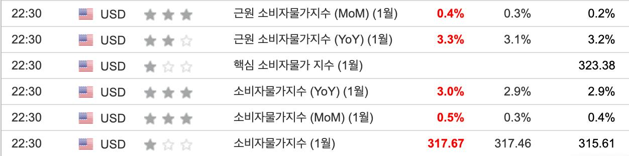 미국 1월 소비자 물가지수는 전월 대비 0.47%(기존 0.36%), 전년 대비 3.0%(기존 2.9%) 상승으로 발표. 변동성이 큰 식품과 에너지를 제외한 근원 소비자 물가지수는 0.41%(기존 0.26%)로, 전년 대비는 3.3%(기존 3.2%)로 상승해 시장 예상을 상회. 세부적으로 보면 중고차 가격이 전월 대비 2.19%, 자동차 보험이 1.99% 급등한 가운데, 임대료가 0.35%로 높아지며 물가 상승을 견인. 핵심 서비스 물가는 0.26%에서 0.51%로, 임대료를 제외한 핵심 서비스 물가도 0.20%에서 0.77%로 급등. 대체로 PCE 가격 관련 품목이 물가 상승을 견인한 점이 부담. 결과 발표에 달러화가 강세를, 특히 국채 금리가 큰 폭으로 상승. 주식시장이 하락.