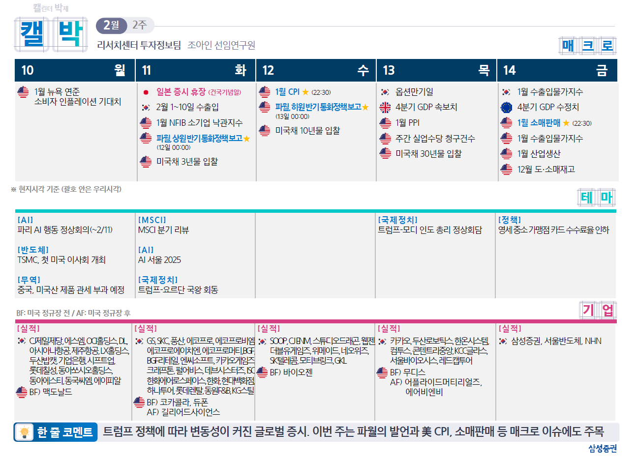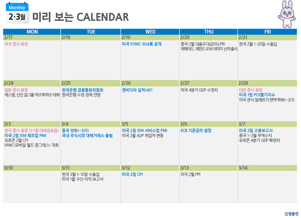 [결국 미국 소비 둔화가 진행됐다는 점]이 특징이지만, 연말 쇼핑시즌 이후 수치라는 점에서 경기 침체 우려를 자극하지는 않음. 그럼에도 소비 둔화가 지속적으로 진행되고 있다는 점은 주목할 필요가 있음. 그리고 산업생산 특히 [산업장비의 증가로 미국 기업들의 자본지출이 확대되고 있다는 점도 주목]. 관련 지표 결과로 미국 경기 둔화는 진행되고 있음을 보여줘 국채 금리 하락, 달러화 약세, 주식시장은 제한적인 등락 속 헤지펀드 공시 자료인 13F에 따라 등락을 보이는 등 종목 장세가 진행