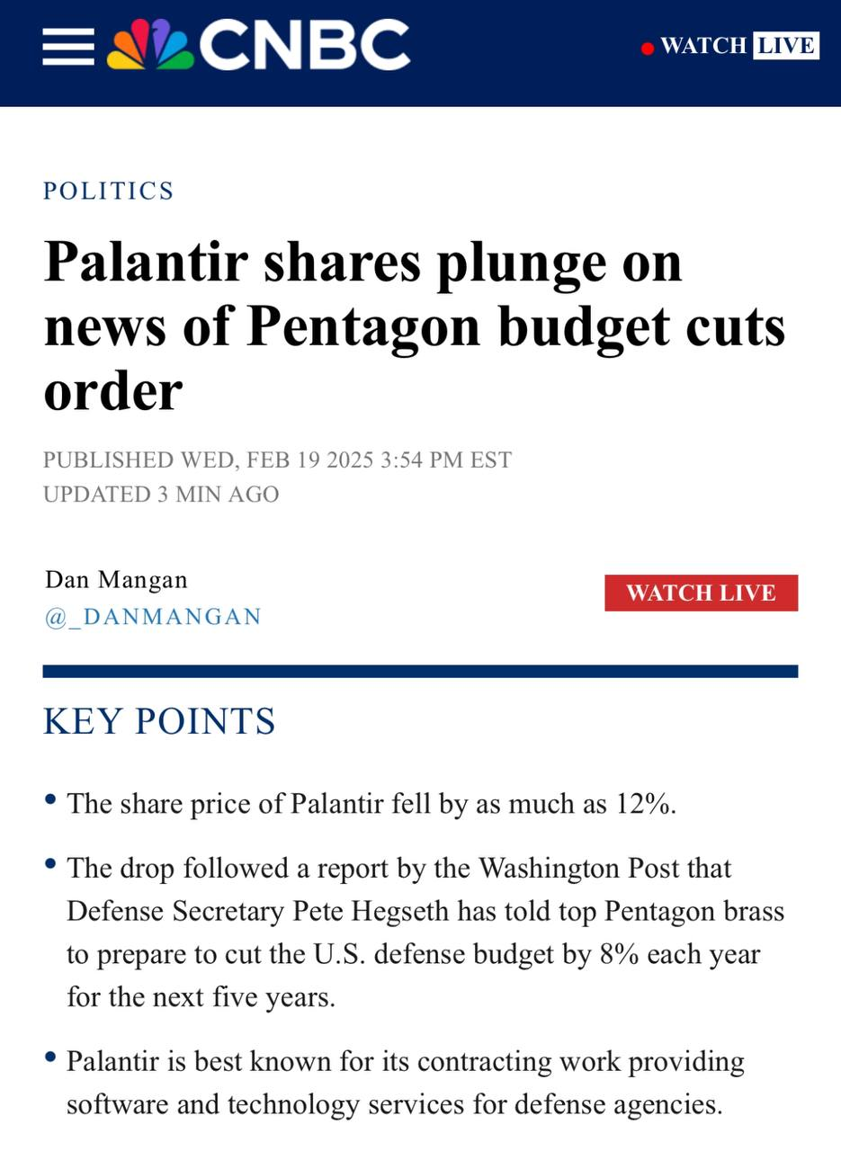 팔란티어(PLTR -10.08%)는 내부자 매도 소식에 하락하던 중 트럼프 정부가 5년간 매년 국방 예산을 8% 줄이는 것을 안을 마련하라고 지시했다는 소식에 하락폭 확대. 관련 예산 축소는 의회 승인 요건. 워싱턴포스트 보도에 따르면, 피트 헤게세스 미 국방장관이 국방부 고위 관계자들에게 향후 5년간 매년 8%씩 국방 예산을 삭감할 것을 준비하라고 지시