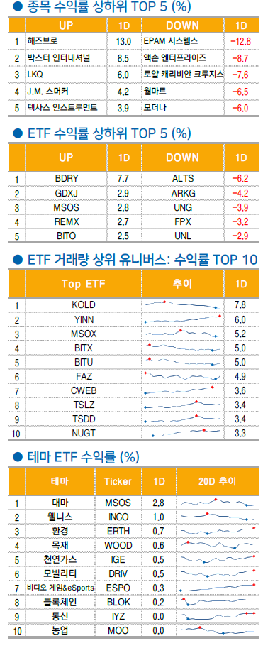 - 전반적으로 크게 하락했지만 방어주 중심으로 상승하면서 빅테크나 기존에 많이 올랐던 종목들이 조정 받는 모습