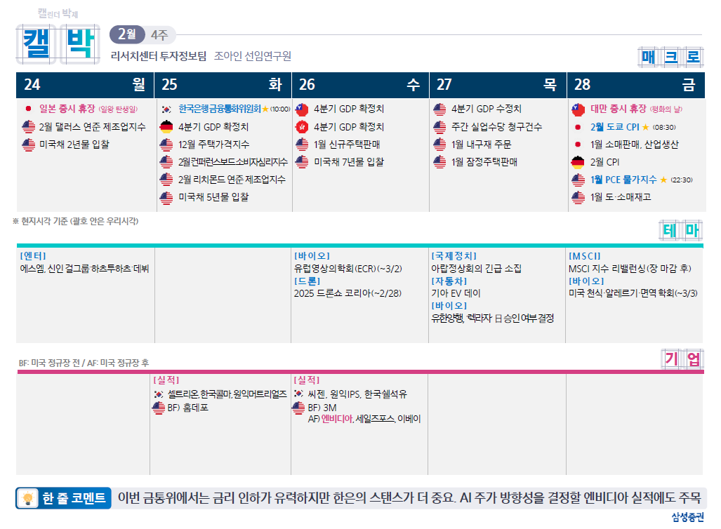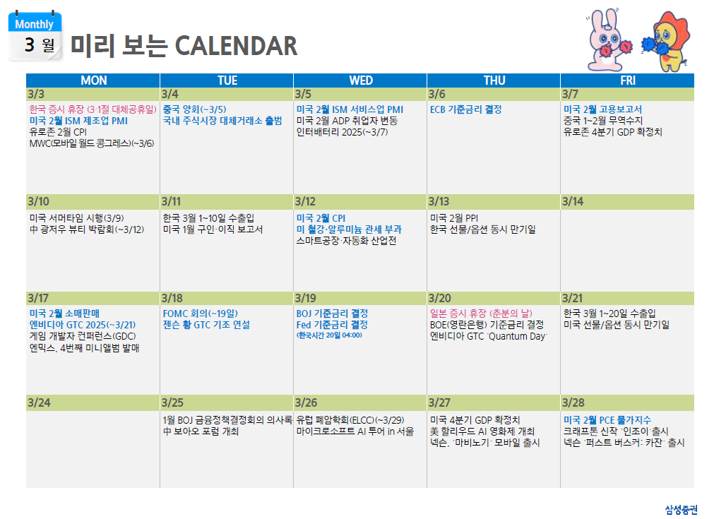 미 국채 금리는 2Y 4.07%(-2.3bp), 10Y 4.26%(-3.8bp)로 불 스티프닝 발생. 예산안에 따른 부채 부담은 일시적으로 금리를 자극했으나 부진한 경기지표들을 반영하며 하락 전환. 유가는 WTI 기준 -0.16% 하락한 $68.82 로 경기 둔화 우려 여파를 지속