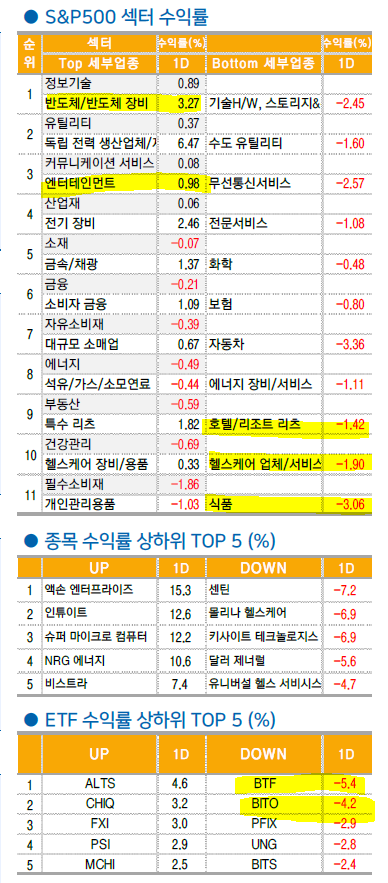 11 개 섹터 중 IT(+0.9%), 유틸리티(+0.4%) 등 4 개 업종만 상승 마감. 엔비디아 실적 대기와 함께 전일 장 마감 후 발표된 인튜이트(+12.7%)의 호실적도 IT 업종에 긍정적 센티 부여. [다만 최근 견조한 흐름 유지하던 필수소비재(-1.9%)와 헬스케어(-0.7%) 등 경기방어적 업종들은 부진]