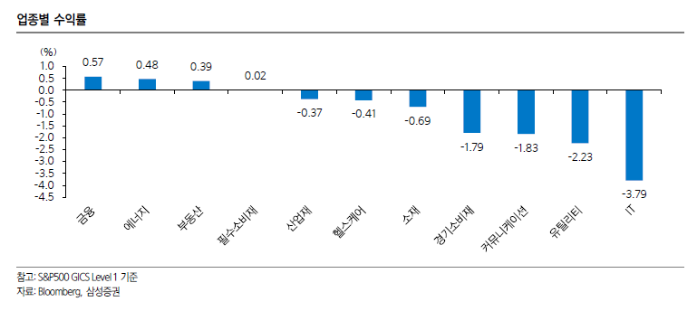 트럼프 관세 언급으로 변동성은 확대되며 장 후반 낙폭 확대. 브로드컴(AVGO -7.11%), 마이크론(MU -6.03%), AMD(AMD -4.99%), TSMC(TSM -6.95%) 등 반도체 종목군도 하락. 인텔(INTC -1.83%)은 대만 정부가 TSMC의 인텔 투자는 정부 허가를 받아야 한다고 언급하자 부분 매각 기대를 부각시키며 장중 상승하다 장 마감 앞두고 하락 전환. 필라델피아 반도체지수는 6.09% 하락. 슈퍼마이크로컴퓨터(SMCI -15.97%)는 두명의 임원이 주식 매도를 한다는 소식 및 전일 재무보고서 제출 후 상장 폐지 우려 해소되며 급등했으나,차익실현 매물 등으로 재차 급락.