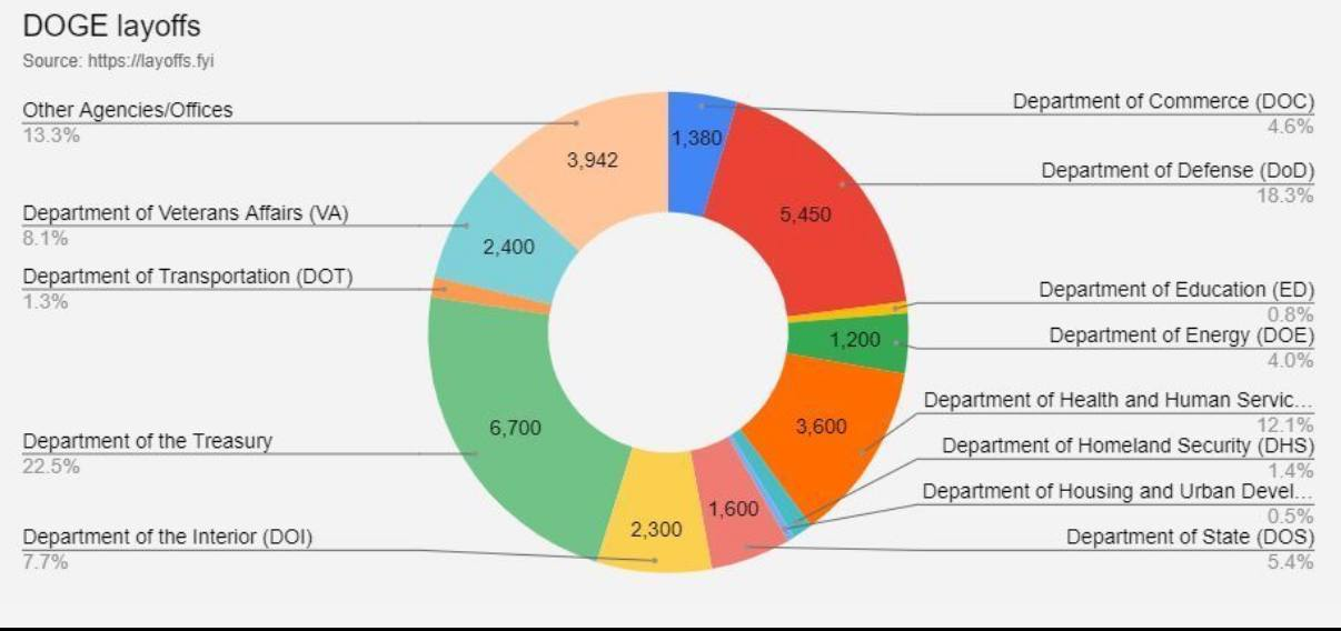 DOGE로 인한 해고 건수는 지금까지 33,000명 정도. 사이트에 의하면 정부 부문 해고 현황은 32,970명. 연방 정부 퇴직 또는 해고 인원은 110,210명으로 추정참고로 Layoffs.fyi 웹사이트는 기술 및 정부 부문의 해고 동향을 실시간으로 기록하고 제공하는 플랫폼 위 차트를 보면 DOGE는 국세청 (IRS)과 재향군인회 (VA)가 해고의 주요 대상임을 알 수 있음 위 차트를 보면 DOGE는 국세청 (IRS)과 재향군인회 (VA)가 해고의 주요 대상임을 알 수 있음