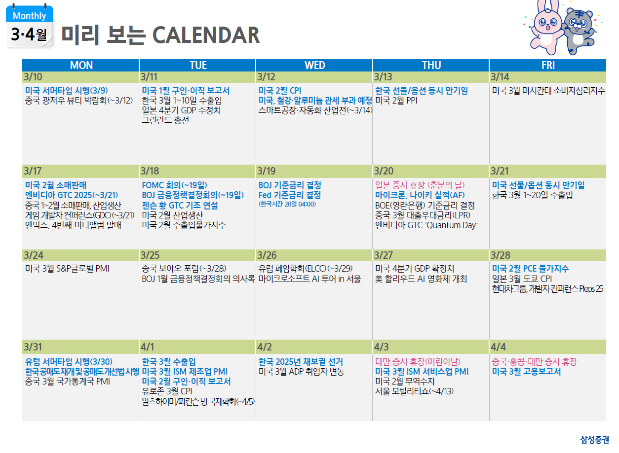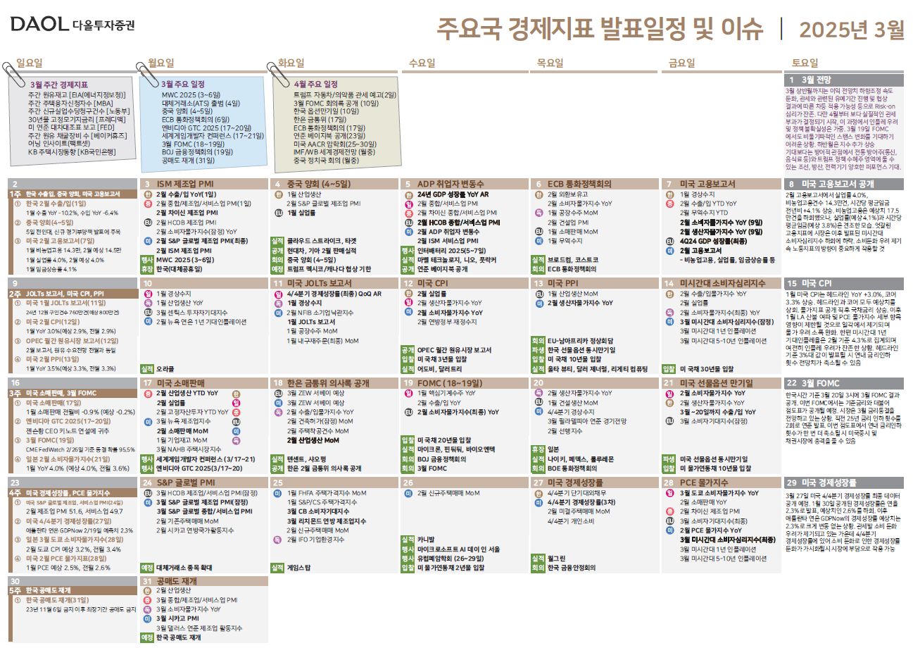 [개장 후] 미 증시는 DOW -2.08%, S&P 500 -2.70%, NASDAQ -4.00%, Russell -2.72%로 하락 마감. 7 일 베센트 재무장관에 이어 현지 기준 9 일 트럼프 대통령의 폭스 인터뷰에서도 경기 침체는 불가피함이 확인. 개장 전 선물시장부터 -2%대 하락하던 나스닥은 장 시작 이후로도 지속적으로 낙폭을 확대.
