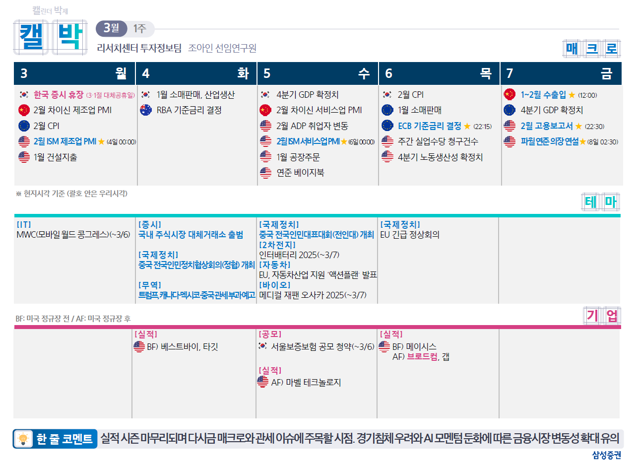 애플(-4.84%)은 시티가 시리 AI 업그레이드 지연을 이유로 아이폰 판매에 타격을 줄 수 있다 경고하며‘Positive Catalyst Watch’에서 제외하자 큰 폭으로 하락. 특히 경기 침체 우려로 매물이 확대된 점도 영향. 알파벳(-4.40%)은 법원 문서에 따르면 법무부가 반독점 수사에서 물러서지 않고 있고, 크롬 매각 우려가 여전히 진행되며 하락. 그 외 메타 플랫폼(-4.42%), MS(-3.34%), 아마존(-2.36%) 등 여타 대형 기술주는 중국 스타트업이 개발하고 지난 3월 6일 출시한 AI 어시스턴트인 Manus가 주목 받으며 하락. 시장은 DeepSeek와 유사한 모습을 보일 수 있다는 우려가 부각. 더불어 경기 침체 우려가 더욱 확대될 경우 현금 보유량이 많은 대형 기술주가 견조할 수 있지만, 개인투자자 중심으로 매수세가 유입되던 개별 기업들이 공포 심리를 반영하며 하락 확대 팔란티어(-10.04%)를 비롯해 세일즈포스(-3.53%), 서비스나우(-7.85%), 그리고 템퍼스 AI(-8.00%), 슈뢰딩거(-5.04%) 등 AI 활용한 바이오테크 종목, 아이온큐(-11.09%), 리게티컴퓨팅(-15.40%) 등 양자 컴퓨터 관련주, 로켓랩(-8.93%), 인튜이티브 머신(-22.69%) 등 우주개발 관련주, 팔라다인 AI(-3.90%), 조비항공(-7.09%), 아처항공(-9.57%) 등 드론 및 비행택시 관련주, 컨스텔레이시션 에너지(-4.86%), GE버노바(-6.62%), 비스트라(-5.09%) 등 원자력 및 전력망 관련주 등 그동안 화두가 되었던 테마주도 공포 심리를 반영하며 큰 폭으로 하락