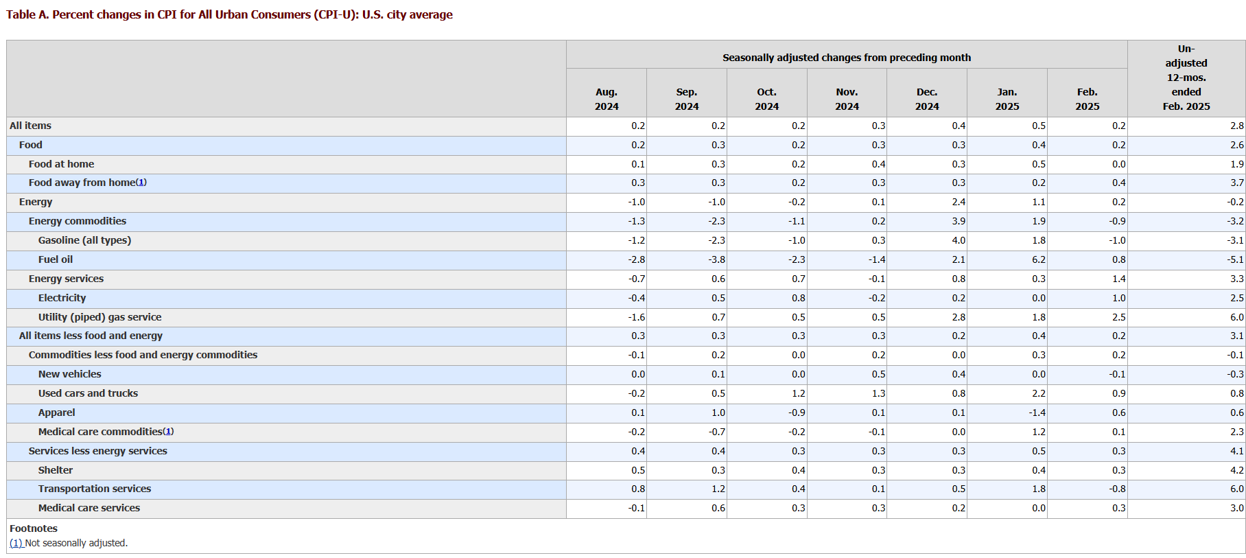 ✅ CPI 상승률 둔화: 1월 0.47% → 2월 0.22% ✅ 식료품 가격 안정: 식료품 상승률 0.46% → 0.01% ✅ 휘발유 가격 하락: 1월 1.75% → 2월 -0.96% ✅ 전기·가스비 급등: 전기료 1.02%, 가스비 2.54% 상승 ✅ 중고차 가격 상승 둔화: 1월 2.19% → 2월 0.88% ✅ 주거비 상승 둔화: 1월 0.37% → 2월 0.28% ✅ 교통 서비스 가격 하락: 1월 0.50% → 2월 -0.81% 1️⃣ 식품 (Food) • 1월: 0.36% vs 2월: 0.16% → 식품 물가 상승 둔화 - 식료품(Food at Home) • 1월: 0.46% vs 2월: 0.01% (급락) - 외식(Food Away from Home) • 1월: 0.24% vs 2월: 0.39% (외식비 상승 지속) 2️⃣ 에너지 (Energy) • 1월: 1.08% vs 2월: 0.20% → 에너지 가격 상승 둔화 - 에너지 상품 (Energy Commodities) • 1월: 1.94% vs 2월: -0.89% (가격 하락 전환) - 휘발유(Gasoline, All Types) • 1월: 1.75% vs 2월: -0.96% (휘발유 가격 하락) - 연료유(Fuel Oil) • 1월: 6.25% vs 2월: 0.84% (상승세 둔화) - 에너지 서비스 (Energy Services) • 1월: 0.31% vs 2월: 1.38% (가격 상승 가속화) - 전기(Electricity) • 1월: -0.04% vs 2월: 1.02% (전기료 상승 전환) - 유틸리티 가스 (Utility Piped Gas Service) • 1월: 1.79% vs 2월: 2.54% (가스비 급등) **식품·에너지를 제외한 물가(Core CPI) • 1월: 0.45% vs 2월: 0.23% 3️⃣ 내구재·비내구재(Commodities Less Food & Energy Commodities) • 1월: 0.28% vs 2월: 0.22% (소폭 둔화) - 신차(New Vehicles) • 1월: 0.04% vs 2월: -0.07% (가격 하락 전환) - 중고차(Used Cars & Trucks) • 1월: 2.19% vs 2월: 0.88% (상승세 둔화) - 의류(Apparel) • 1월: -1.38% vs 2월: 0.60% (가격 반등) - 의료용품(Medical Care Commodities) • 1월: 1.17% vs 2월: 0.12% (상승 폭 축소) 4️⃣ 서비스 물가 (Services Less Energy Services) • 1월: 0.51% vs 2월: 0.25% - 주거비(Shelter) • 1월: 0.37% vs 2월: 0.28% (주거비 상승 둔화) - 임대료(Rent of Primary Residence) • 1월: 0.35% vs 2월: 0.28% (소폭 둔화) - 교통 서비스(Transportation Services) • 1월: 0.50% vs 2월: -0.81% (가격 하락 전환) - 의료 서비스(Medical Care Services) • 1월: 0.18% vs 2월: 0.31% (소폭 상승)모든 도시 소비자를 위한 소비자 물가 지수(CPI-U)는 계절적으로 조정된 기준으로 0.2% 증가했습니다.