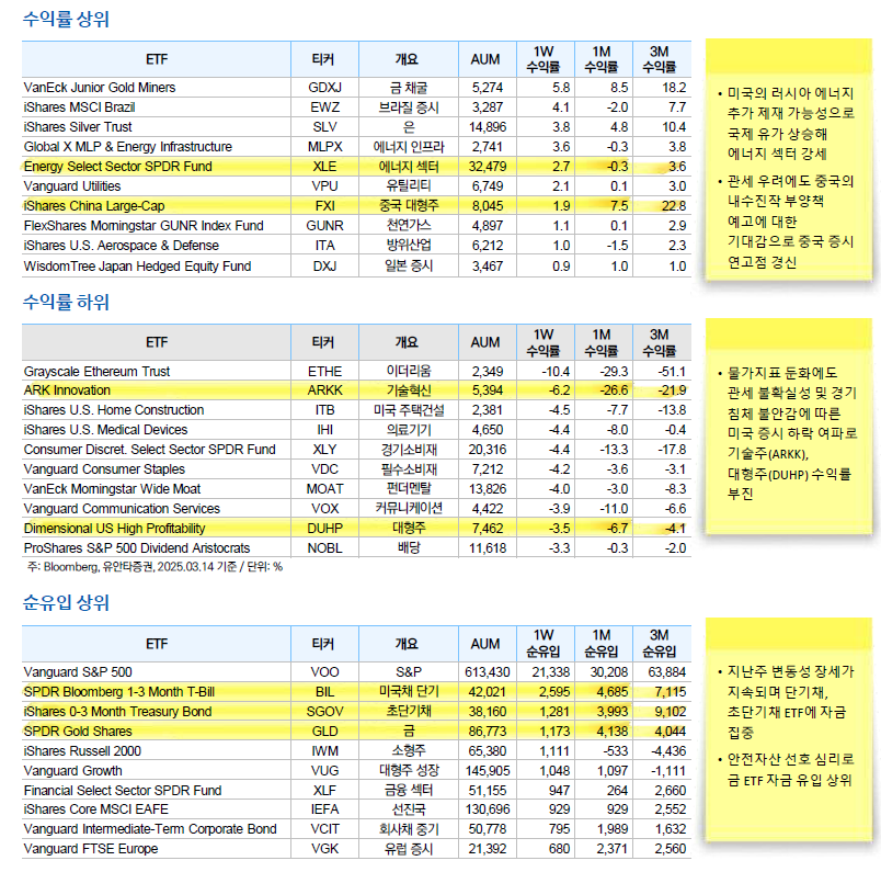 빅테크를 제외한 중형주를 중심으로 회복세 출현. S&P500 기준 458 개 기업이 상승 마감하며 전반적인 시장 센티 회복을 보인 반면 M7(MAGS, -1.0%)의 경우 테슬라(-4.8%)와 엔비디아(-1.8%)의 약세와 함께 구글, 메타, 아마존 5 개 기업이 하락11 개 섹터 중 경기소비재(-0.4%)를 제외한 10 개 섹터 상승 마감. 경기소비재는 테슬라의 영향 불가피. 엔비디아를 비롯한 IT(+0.2%) 부문은 내일 있을 젠슨황의 GTC2025 기조연설을 대기. 부동산(+1.7%), 에너지(+1.6%), 필수소비재(+1.6%), 산업재(+1.4%) 등이 강세를 주도했으며 월마트(+2.5%) 등 소비 중심의 리테일러의 회복세 두드러짐. 그간의 침체 우려를 덜어낸 영향