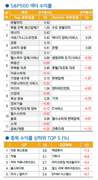 업종 단에선 11 개 섹터 중 6 개 업종 하락 마감. 특히 전일 상승폭 두드러졌던 정보기술(-0.49%)는 FOMC 안도랠리 중단, 액센츄어 어닝쇼크 등으로 재차 하락세