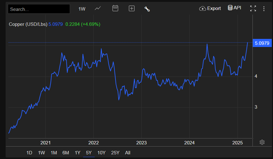 전기동(구리), 구리 선물 가격이 파운드당 $5.10을 넘어 2024년 3월의 기록적인 고점에 근접했습니다. 이는 거래자들이 아시아에서 미국으로 선적을 전환하여 더 높은 가격을 활용하고 [잠재적인 관세를 피하려는 움직임] 때문입니다. 보고서에 따르면, 10만에서 15만 미터톤의 정제 구리가 향후 몇 주 내에 미국에 도착할 것으로 예상되며, 이는 중국의 공급을 긴축시키고 정부의 소비 촉진 노력 속에서 수요가 반등할 것으로 예상되는 시점에 맞물립니다.