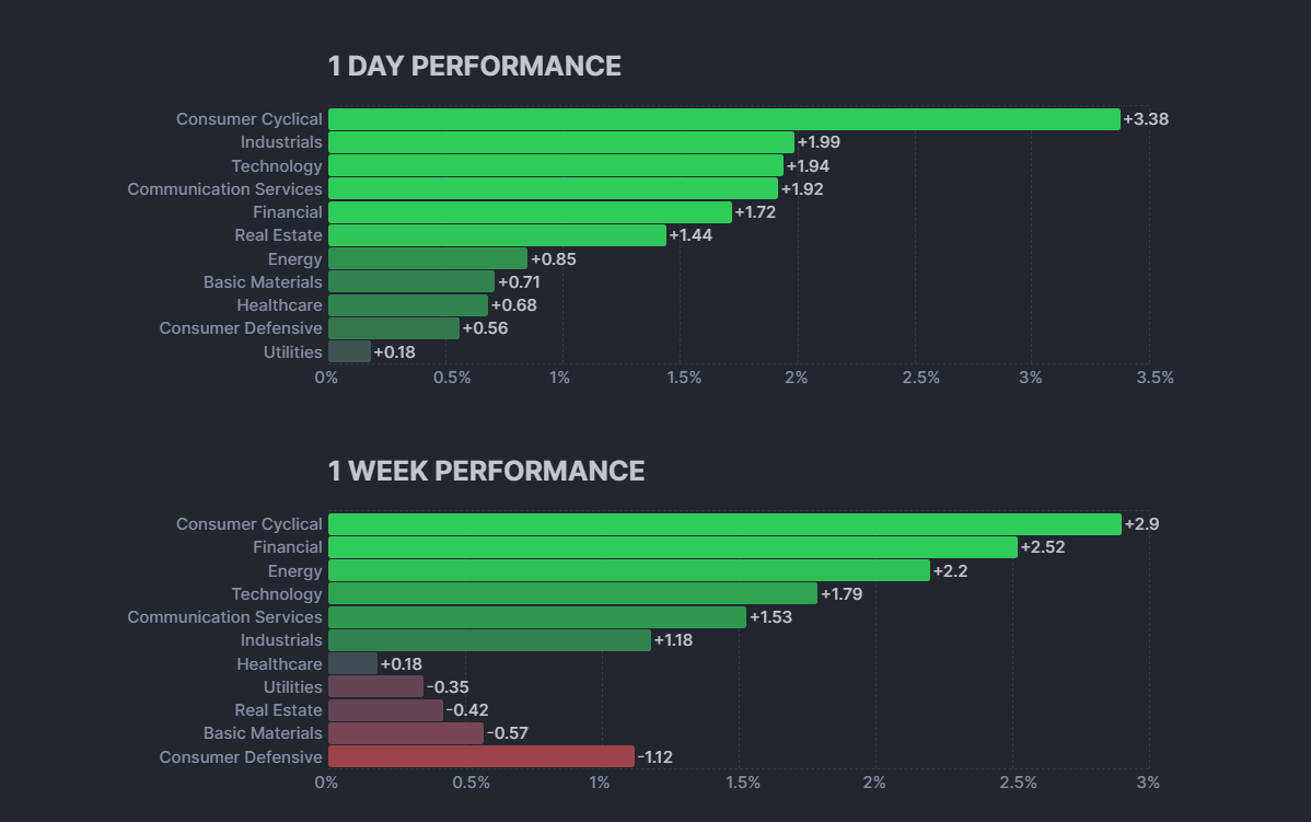 11 개 섹터 중 유틸리티를 제외한 전 업종 상승 마감. 그간 트럼프 정책에 대한 불안과 실망으로 부진했던 테슬라(+11.9%), 팔란티어(+6.4%) 등 트럼프 트레이드 종목들이 강하게 반등. M7 종목들(MAGS, +3.3%)도 강세. 경기소비재(+4.1%), 컴스(+2.1%), 산업재(+1.9%) 등이 아웃퍼폼. 관세에 따른 비용 압박과 불확실성에 취약했던 중소형주(러셀)도 급등