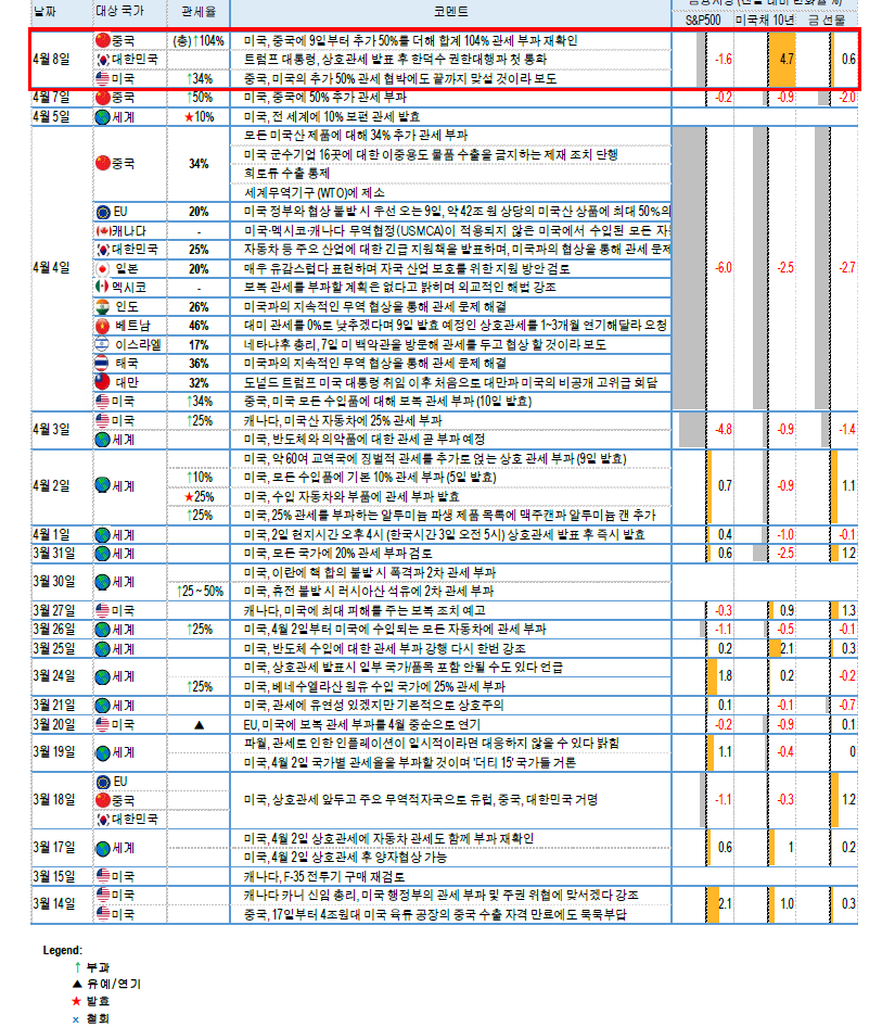다만 이후 중국이 강경한 스탠스를 유지. 미 백악관은 10%(2 월,펜타닐)+10%(3 월,펜타닐)+34%(상호관세)+50%(재보복 관세)로 총 104%의 관세가 중국에 부과될 것이라 발표. 발효 시점은 9 일 0 시 1 분 상황이 급격히 악화되었던 가운데 밴스 부통령의 실언도 조명되며 외교적 텐션을 악화. 밴스 부통령은 3 일 폭스뉴스에서 중국을 촌놈(Peasants)라 명칭. 8 일 중국 언론들이 이를 대서특필하며 미국에 대한 반감↑ 한편 EU 와의 협상 상황에서는 EU 의 공산품 무관세 제안을 트럼프가 거절. 9 일 EU 집행위 대미 보복관세 표결 결과 발표에 이목이 집중.