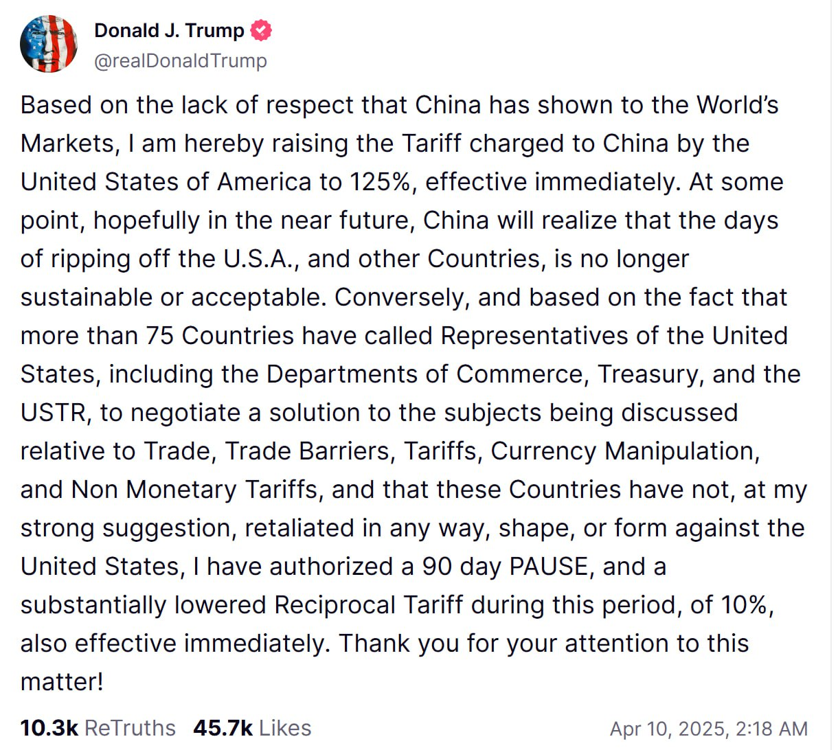 세계 시장에 대해 중국이 보여준 존중의 결여를 바탕으로, 나는 중국에 부과되는 미국의 관세를 125%로 즉시 인상함을 여기서 밝힙니다. 언젠가, 가까운 미래에, 중국은 미국과 다른 국가들을 착취하는 시대가 더 이상 지속 가능하지도, 용납되지도 않는다는 것을 깨닫게 될 것입니다. 반대로, 75개국 이상이 미국 상무부, 재무부, 무역대표부(USTR)를 포함한 대표자들과 접촉하여, 무역, 무역 장벽, 관세, 환율 조작, 비통화 관세 등에 관련된 주제에 대한 해결책을 협의하려는 움직임이 있었고, 이러한 국가들이 내 강력한 요청에도 불구하고 미국에 대해 어떤 형태로든 보복하지 않았기 때문에, 나는 90일간의 일시 중단(PAUSE)을 승인하고, 이 기간 동안 상호 관세를 10%로 대폭 인하하기로 했습니다. 이것 역시 즉시 발효됩니다.