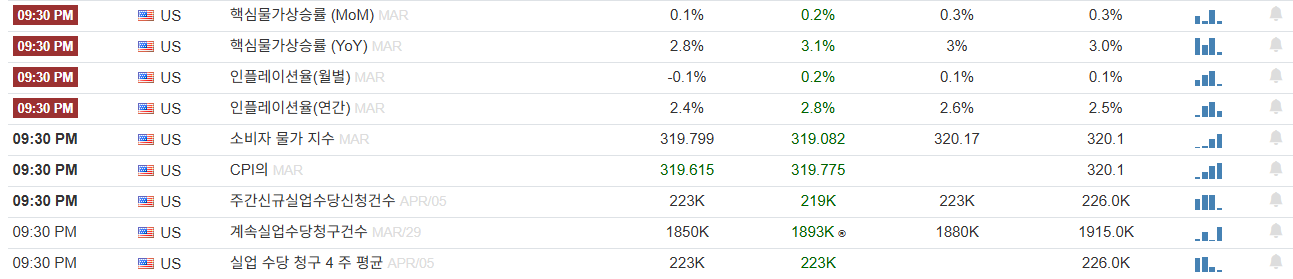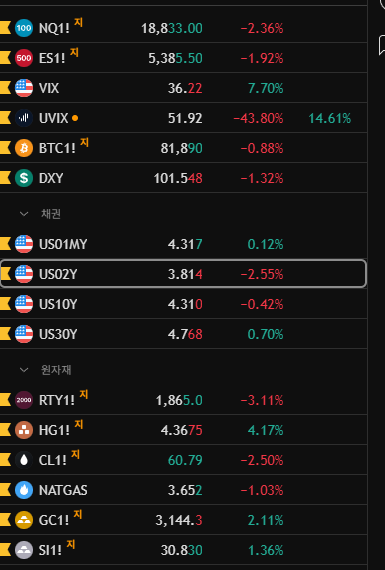 다만, CPI가 양호하게 나왔음에도 4월 관세 우려 때문인지, 금리인하를 나타내는 2년물은 급락중이지만, 어제 급등했던 나스닥은 회복을 하지 못하는 모습