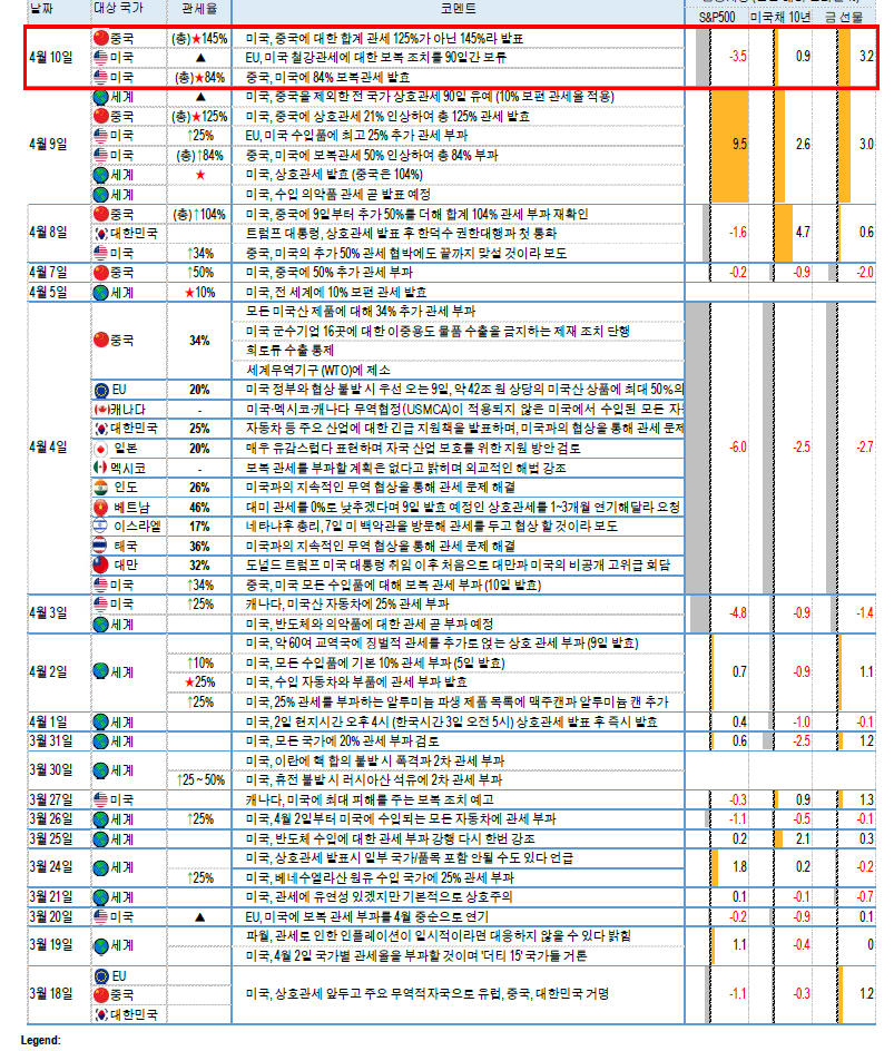 미 국채 금리는 2Y 3.85%(-11.5bp), 10Y 4.37%(-11.6bp)로 하락. 금일 뉴욕 연은 서베이에서 장기 인플레 급등까진 확인되지 않은 가운데 연준과 재무부의 시장 안정화 의지가 확인되며 채권 가격 회복. 월러 이사는 관세로 인한 인플레 상승보다 경기 침체 위험 대응에 주력할 것임을 강조.