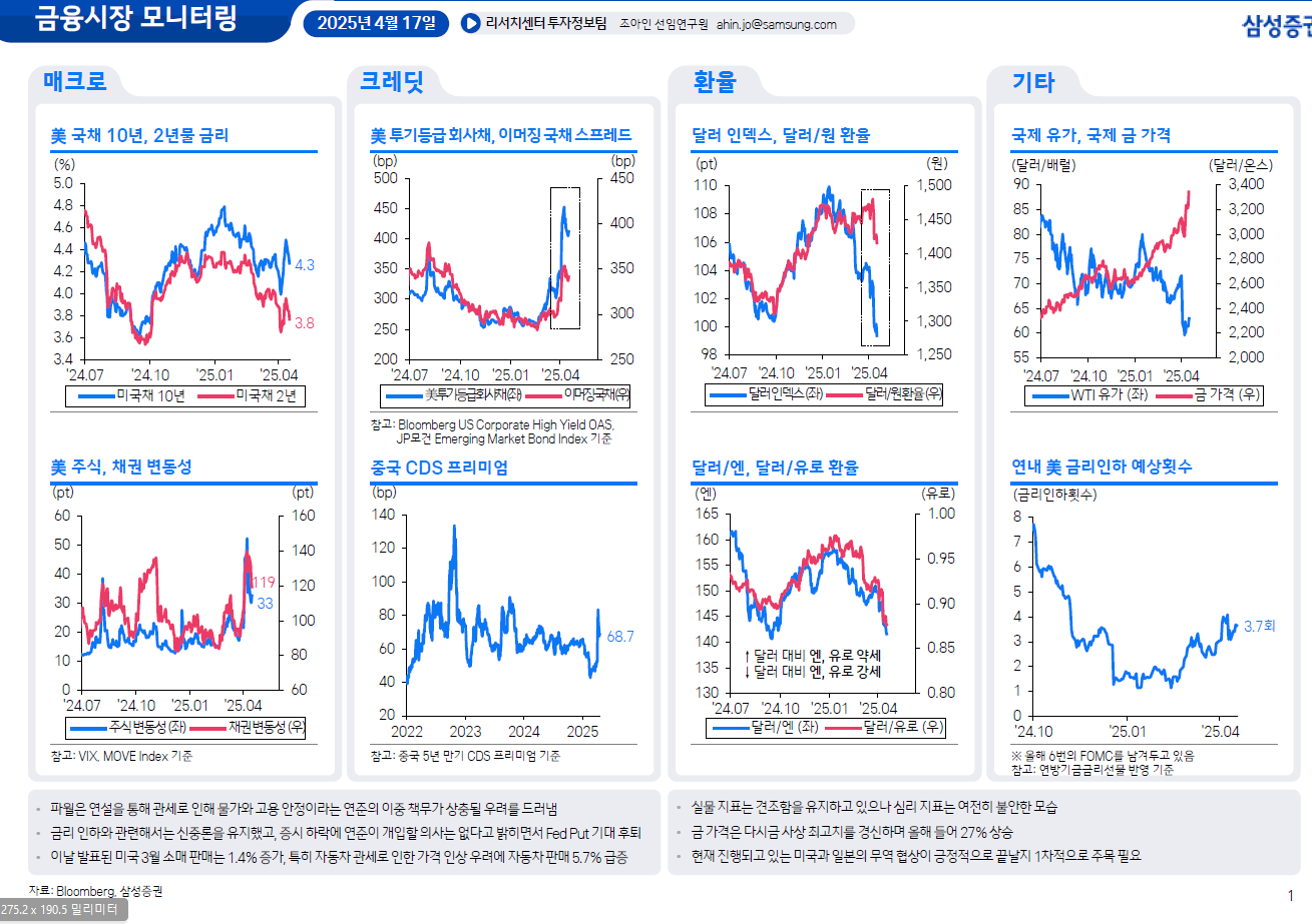 국채 금리는 견조한 소매판매 등으로 상승하기도 했지만, 관세로 인한 경기 둔화 우려가 부각되며 하락. 더불어 파월이 금리 인하 지연 언급에 잠시 반등을 주기도 했지만, 경기에 대한 불안을 경고하자 하락이 더욱 확대. 여기에 최근 채권 시장은 디레버리징 영향으로 나온 일시적인 변화라고 언급하자 하락이 지속. 한편, 20년물 국채 입찰에서 응찰율이 12개월 평균 2.60배를 상회한 2.63배, 간접입찰도 69.8%에서 70.7%로 상승하며 수요가 견고함을 보인 점도 하락 요인.