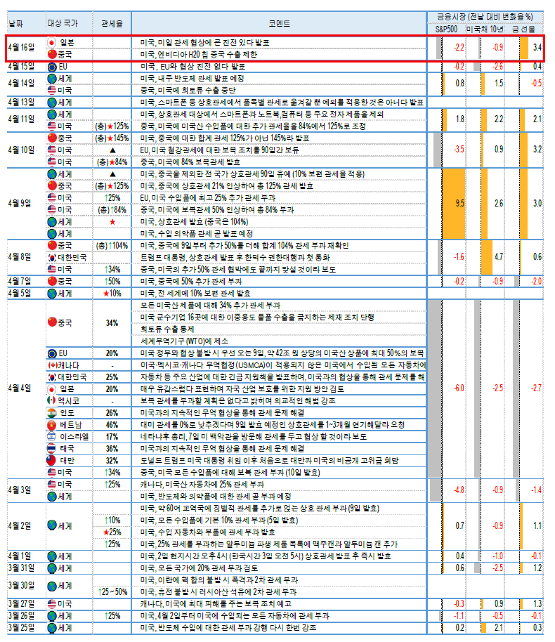 한편, 장 초반 주식시장 하락 요인은 유나이티드헬스(-22.38%)와 엔비디아의 영향도 있었지만 금리 상승과 IMF 게오르기에바 총재의 발언도 영향. 게오르기에바 총재는 IMF가 다음 주에 경기 침체는 아니지만 상당한 성장률 인하를 포함한 전망을 발표할 전망이라고 발표. 경기에 대한 불안 심리를 자극. 여기에 EU가 미국의 국채가 ‘안전자산’ 지위에 있는지 의문스럽다고 주장하자 국채 금리가 상승을 확대. 트럼프가 최근 상호관세 90일 유예도 채권시장의 급락(금리 급등)에 따른 결과라는 분석을 할 정도로 중요한데 EU가 이를 건드렸고 이에 시장에 불안을 부추김. 결국 관세가 글로벌 경제와 미국 채권 시장에 미치는 영향이 커지고 있음을 보여준 사례인 만큼 향후에도 경기와 채권시장에 주목할 필요가 있음 *FICC: 장기 금리, EU의 안전자산 회의론 언급 등으로 하락
