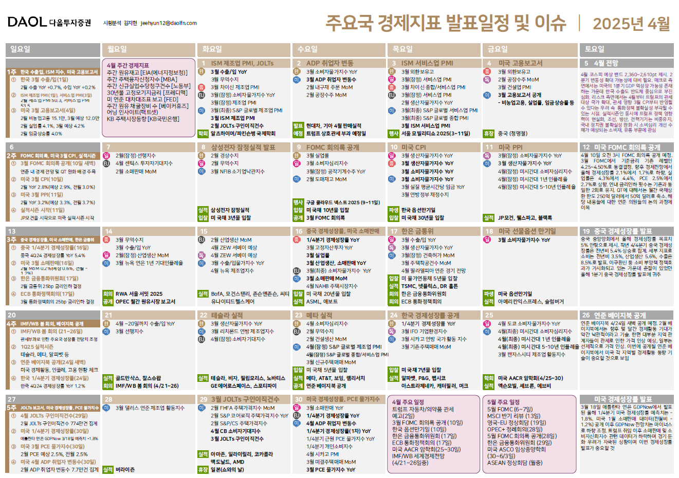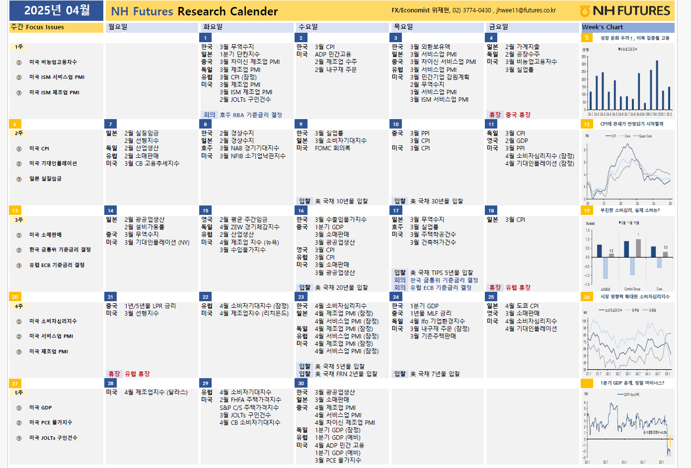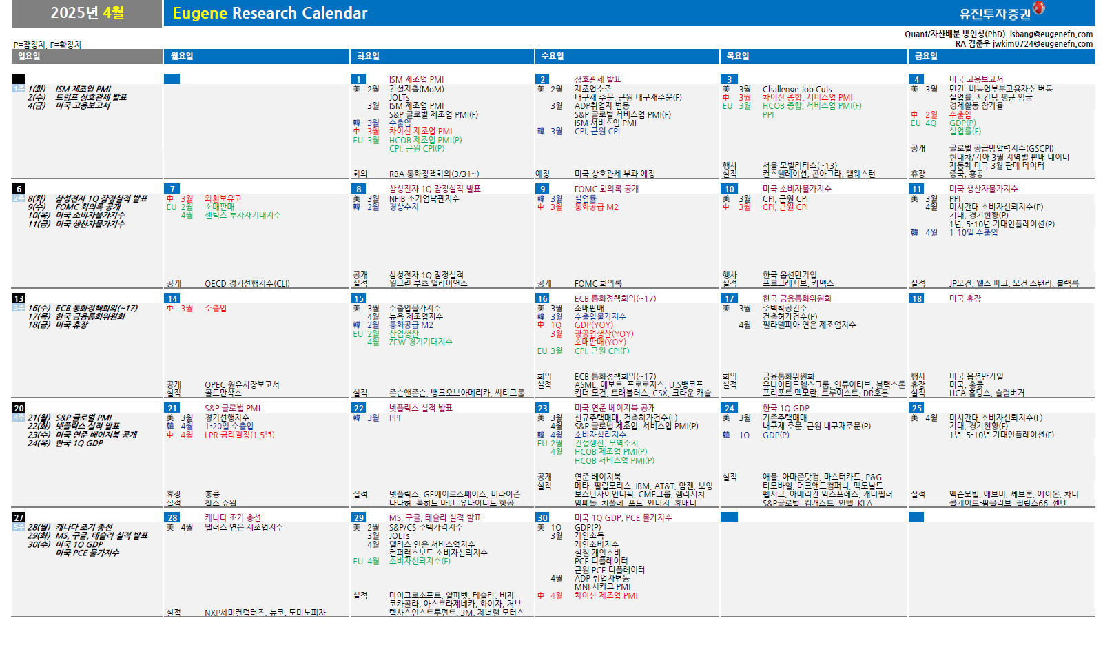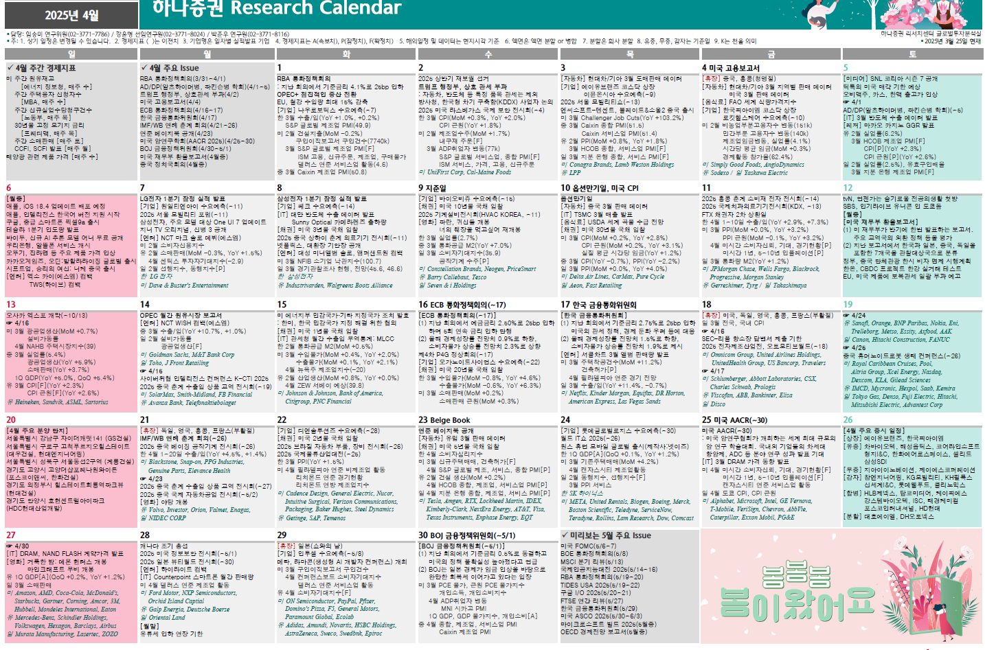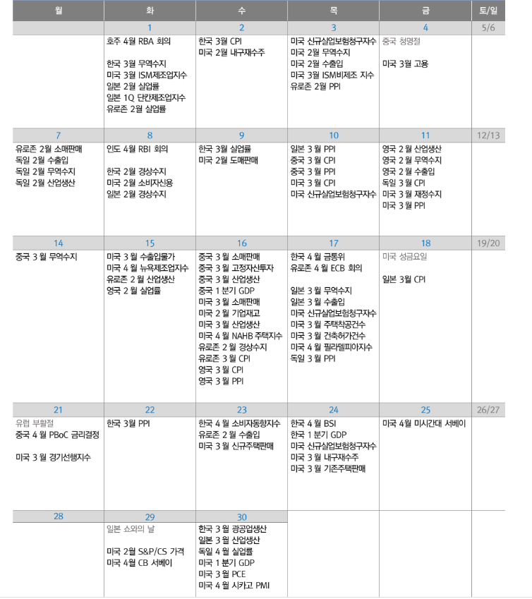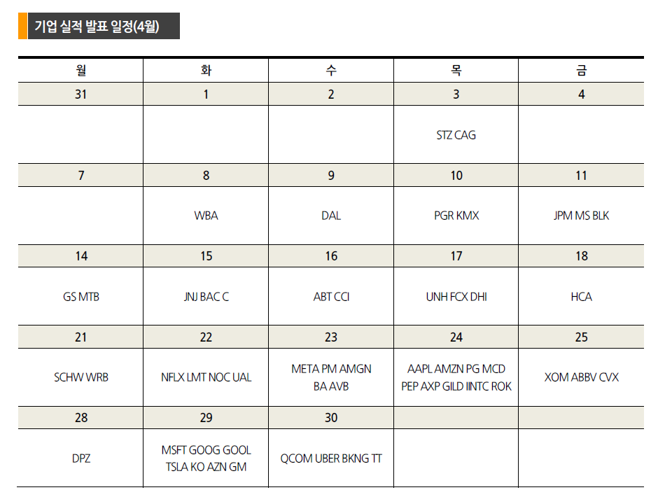 04/23(수) 한국: 소비자동향조사 독일: 제조업, 서비스업 PMI 유로존: 제조업, 서비스업 PMI, 수출입 동향 미국: 제조업, 서비스업 PMI, 신규주택판매 보고서: 베이지북 채권: 미 5년물 국채 입찰 발언: 굴스비 총재, 월러 연준이사, 베일리 BOE 총재 실적 장전: 필립모리스(PM), AT&T(T), 써머피셔(TMO), 보스턴 사이언티픽(BSX), 넥스트라에너지(NEE), 보잉(BA), GE버노바(GEV) 실적 장후: IBM(IBM), 서비스나우(NOW), 텍사스인스트루먼트(TXN), 램리서치(LRCX), 오리얼리 오토모티브(ORLY), 뉴몬트(NEM), 치포슬 멕시칸 그릴(CNG) 04/24(목) 한국: GDP 성장률 독일: Ifo 기업환경지수 미국: 국가활동지수, 내구재주문, 기존주택매매 채권: 미 7년물 국채 입찰 발언: 카시카리 총재, 게오르기에바 IMF 총재 실적 장전: P&G(PG), 머크(MRK), 펩시코(PEP), 유니온 퍼시픽(UNP), 사노피(SNY), 브리스톨 마이어스(BMY), 프리포트-맥모란(FCX), 노키아(NOK), 사우스 웨스트 에어라인(LUV), 아메리칸 에어라인(AAL) 실적 장후: 알파벳(GOOG), 길리어드사이언스(GILD), 인텔(INTC)