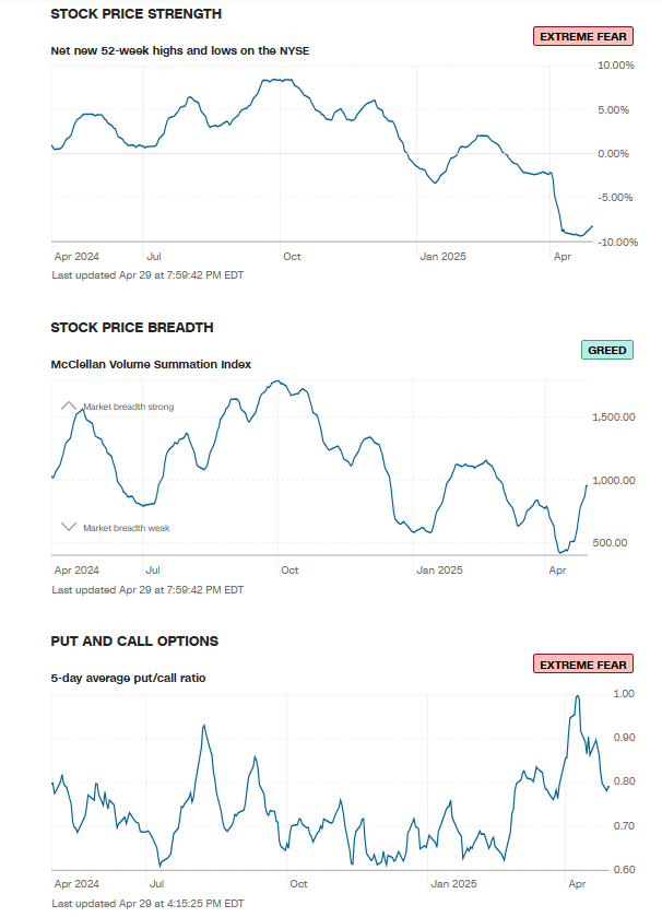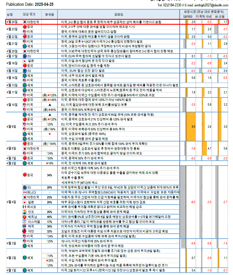 미 국채 금리는 2Y 3.65%(-4.3bp), 10Y 4.17%(-3.7bp)로 하락세 지속. 장기물 금리는 1 주일간 -22 bp 가량 하락하며 신뢰 회복에 따른 채권 매수세 지속과 경기 지표 부진에 따른 금리 인하 기대감을 반영. 유가는 WTI 기준 -2.63% 하락한 $60.4 로 미-중 무역 흐름 둔화 반영. 금 가격은 -0.79% 하락한 온스당 $3,317 기록