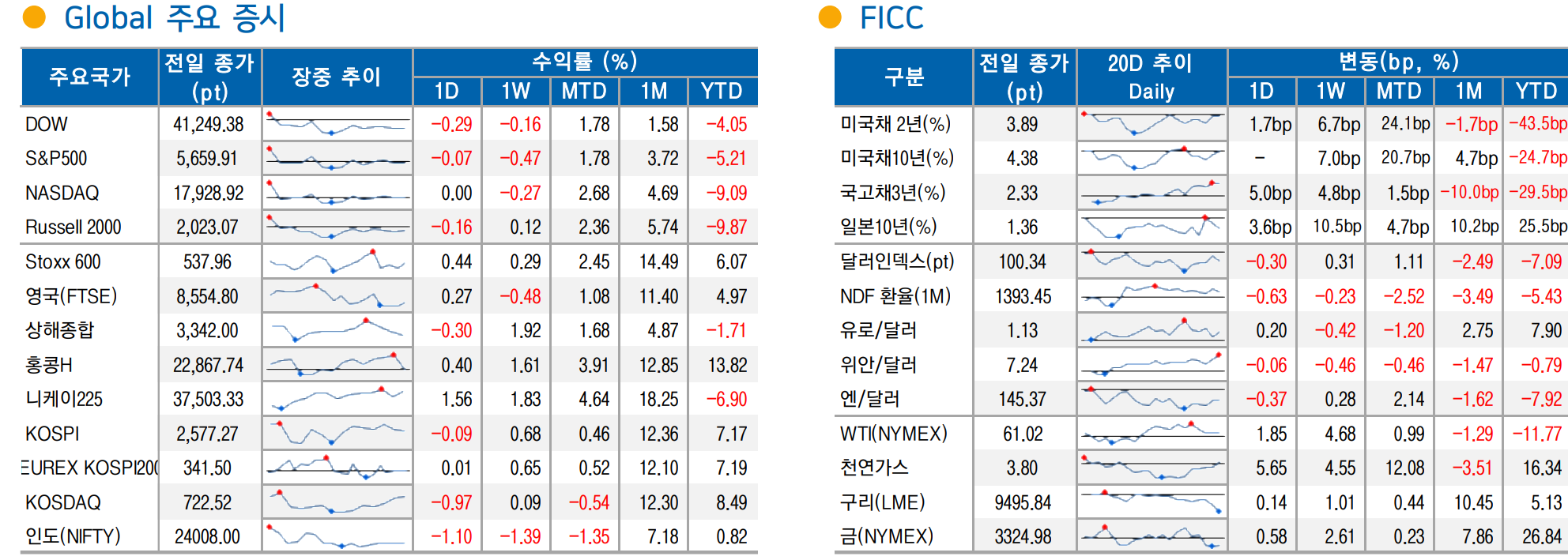 국채 금리는 전일 급등에 따른 되돌림이 유입되며 하락 출발 했지만, 연준 위원들이 관세로 인한 불확실성이 높아진 가운데 물가 상승 압력이 높아지고 있다는 점을 언급하자 하락폭 축소. 물론, 경기에 대한 불안도 언급하며 그 폭은 제한 된 모습. 더 나아가 주말에 있을 미-중 무역 협상을 기다리며 관망세가 진행된 점도 특징을 보인 가운데 단기물은 하락하고 장기물은 상승하는 차별화 속 혼조 마감 금은 달러 약세와 미-중 협상을 기다리며 상승. 특히 연준 위원들의 물가 상승 압력에 대한 언급이 영향. 다만, 시간이 지나며 상승폭을 축소하며 마감. 구리 및 비철금속은 LME 시장과 중국 상해 선물 거래소에서 구리 재고가 크게 감소했음에도 구리 가격은 하락. 미-중 무역협상을 기다리며 일부 매물이 출회된 데 따른 것으로 추정. 그 외 품목은 재고 감소 등을 바탕으로 상승. 농작물은 밀이 전일 주간 수출 판매 보고서를 통해 예상보다 부진한 수출을 발표하자 하락. 옥수수와 대두는 소폭 상승