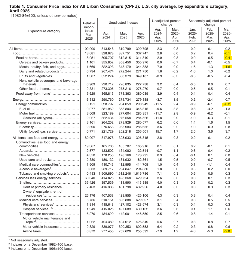 🍽 [식료품 및 외식] • 식료품 전체: -0.1% (전월: +0.4%) → 계란·육류 가격 급락 • 가정용 식품: -0.4% (전월: +0.5%) → 2020년 9월 이후 최대 하락 • 외식(식당): +0.4% (전월: +0.4%) → 지속적 상승 • 전년 대비 외식물가: +3.9%, 가정식품: +2.0%