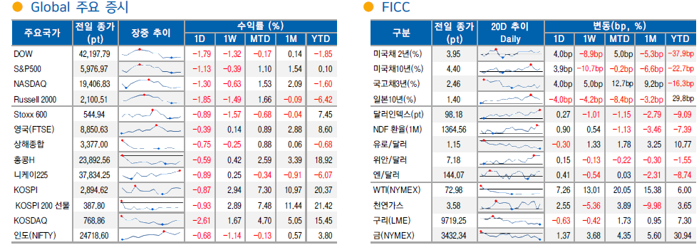 11 개 섹터 중 에너지(1.7%)를 제외한 10 개 섹터 하락 마감. 금융(-2.1%), IT(-1.5%), 소재(-1.2%) 등이 언더 퍼폼. 유가 급등에 따라 엑슨모빌(+2.2%) 등 에너지 업종과 지정학적 리스크에 따른 우주항공/국방(+0.8%) 부문 강세. 불확실성 확산으로 최근 주가와 실적 모멘텀이 가장 좋은 오라클(+7.7%)로의 매수세 집중도 확인. M7(-0.7%)도 AI 투자 심리와 견고한 펀더멘탈로 증시 하단을 지지