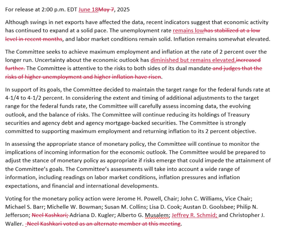 1️⃣ 연준은 예상대로 정책금리를 4.25~4.50%로 만장일치 동결 (4회 연속 동결). 정책 결정자들이 앞으로의 경제 데이터를 지켜보며 상황을 판단하고자 한다는 점을 재확인함힘