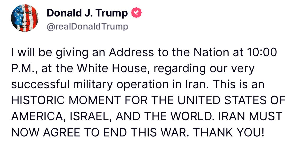 ▪️트럼프는 공습 후 즉시 성명을 발표하면서 공습이 매우 성공적이었다고 자평하며 이란측에 협상에 복귀할 것을 강요하고 추가 공습을 경고했다.