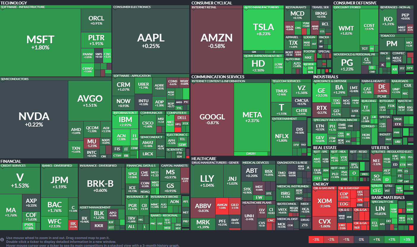 11 개 섹터 중 에너지(-2.5%)를 제외한 전 섹터 상승 마감. 자유소비(+1.8%)는 테슬라(+8.2%)의 성공적인 로보택시 출시에 힘입어 가장 큰 폭으로 상승. 부동산(+1.5%)는 금리 하락에 따른 상승세