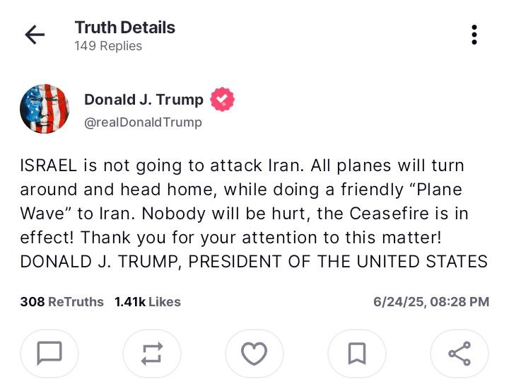 트럼프가 이스라엘과 이란이 완전한 휴전에 합의했다고 발표. 이스라엘과 이란 양국이 ‘12일 전쟁’이라고 불리는 전쟁을 끝낼 수 있는 용기와 지성을 가진 것을 축하한다고 언급. 반스 부통령은 이란에 대한 공격은 상징성이라고 주장한 가운데 임무는 성공했다고 주장.