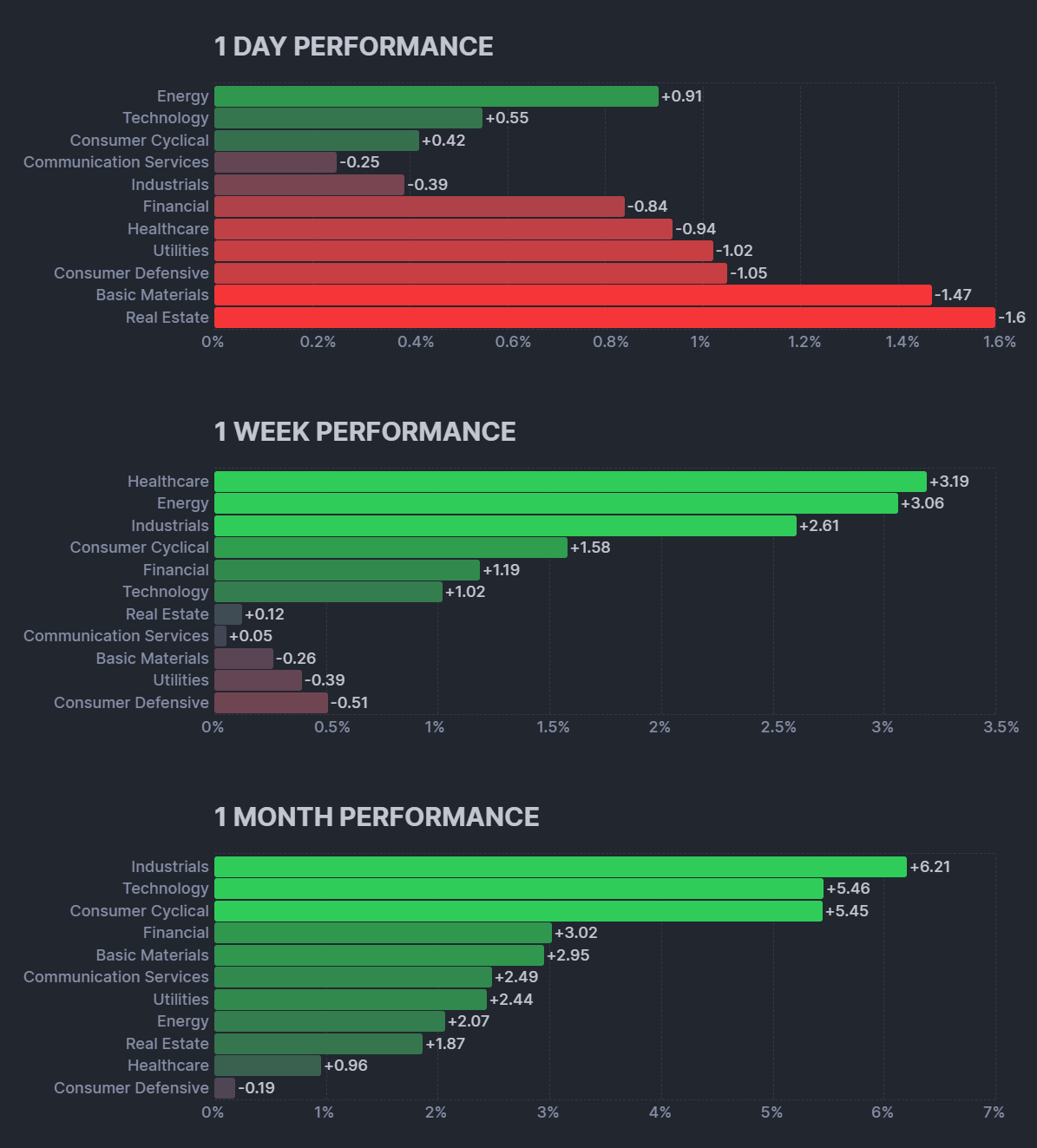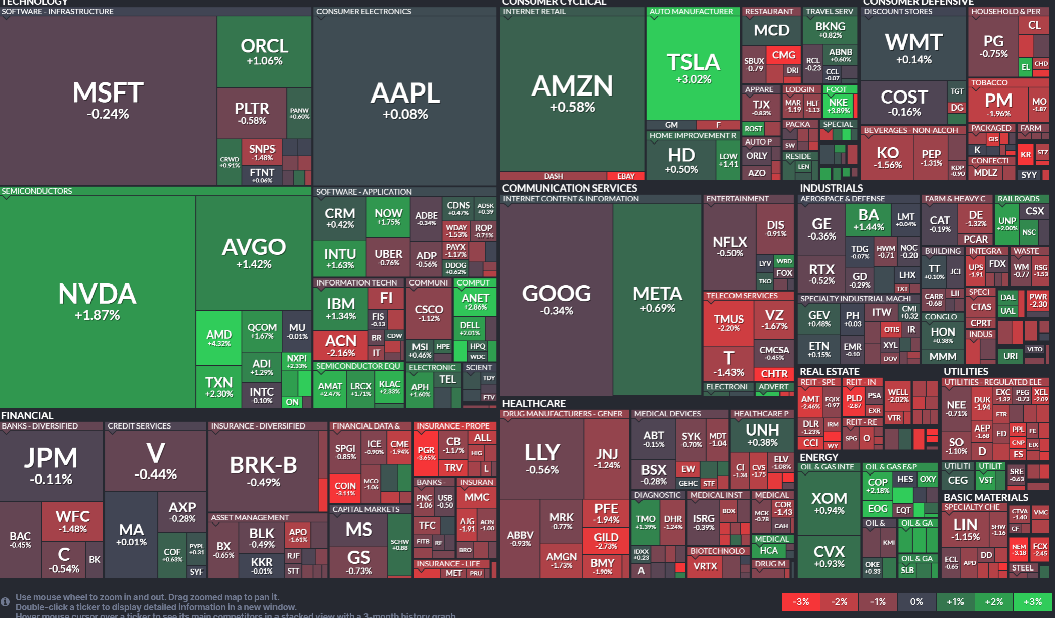 기술 섹터는 엔비디아의 중국향 AI 칩 수출 재개 소식과 주요 기업들의 AI 투자 확대 기대감으로 상승했습니다. 특히 반도체 부문이 강세를 보이며 나스닥 지수 상승을 주도했습니다.