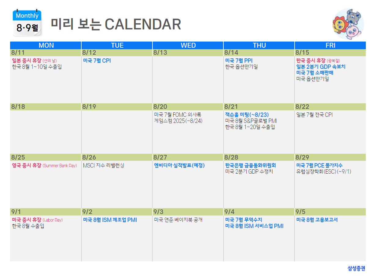 - 8월 9일(토): 7월 소비자물가지수 (CPI)