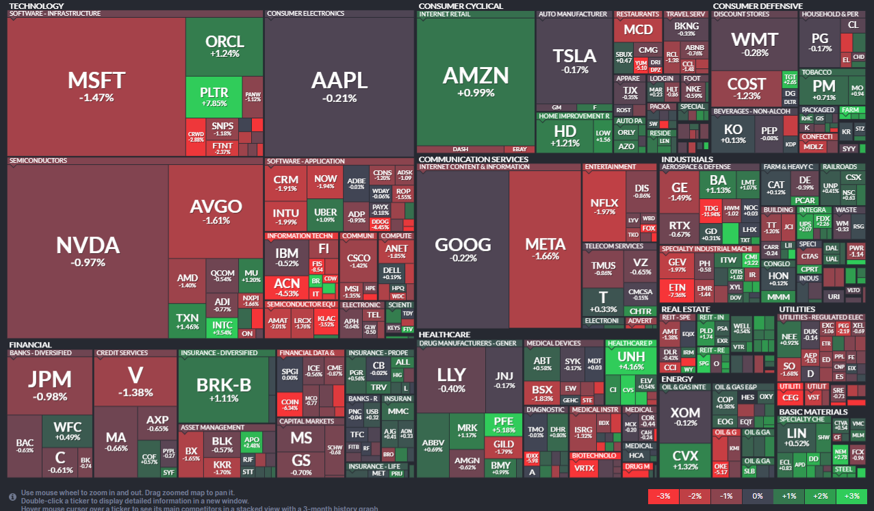 반도체 관세 예고에도 불구하고 팔란티어의 강력한 실적으로 일부 상쇄되었습니다. 그러나 전반적으로는 관세 우려와 경기둔화 우려로 약세를 보였습니다.