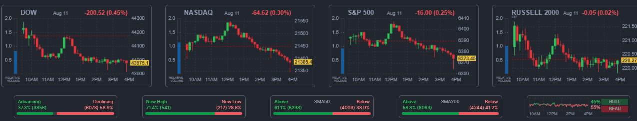 - 다우존스 산업평균지수: 43,975.09 (-200.52p, -0.45%)