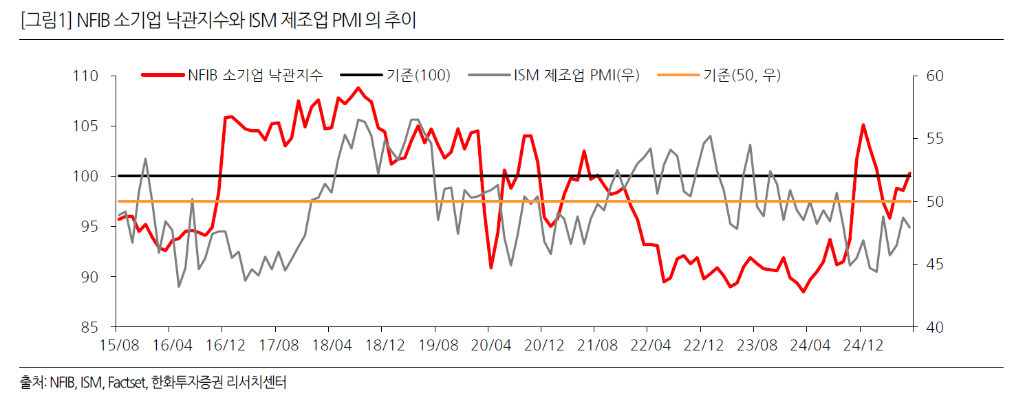 [NFIB 소기업 낙관지수는 ISM 제조업 PMI를 선행하는 경향]이 있다. NFIB 소기업 낙관지수 설문조사 대상은 중소기업이라 ISM 제조업 구매 관리자 지수 응답자들보다 경제 변화에 민감하기 때문이다. 시차를 두고 ISM 제조업 PMI도 확장될 여지가 있다. 거시 환경에 대한 불안은 여전히 남아있으나, 데이터센터 건설 및 첨단시설 리쇼어링 등에 대한 긍정적인 관점을 지속한다.