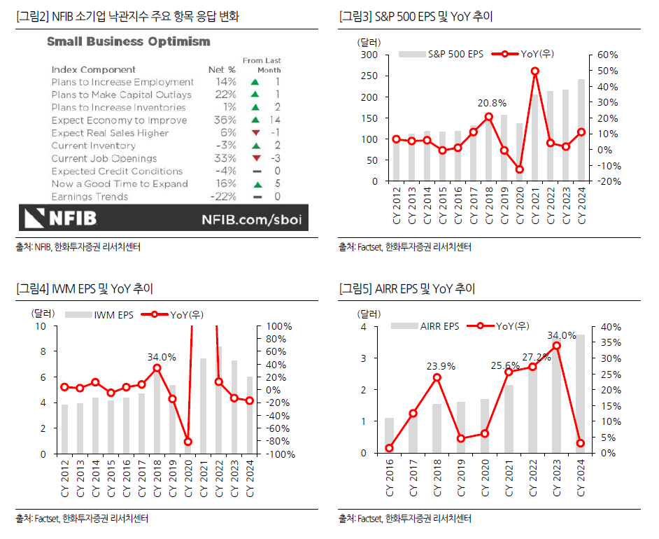 트럼프 행정부 1기 당시 ISM 제조업 PMI와 NFIB소기업 낙관지수 모두 확장국면에 있었음을 강조했다. 2017년과 2018년에는 금리인상과 미-중 무역 갈등이 있었음에도 기업들의 업황 평가는 양호했다. 세제혜택과 규제완화로 기업 친화적인 환경이 조성됐기 때문이다. 대표적으로 2017년엔 트럼프 행정부 1기 주요 세제 혜택인 ‘세금 감면 및 일자리 창출법(Tax Cut & Job Act, TCJA)’이 있다. 해당 법은 2018년에 시행했다. 세제 혜택 덕분에 S&P 500과 IWM의 EPS의 성장률은 기저효과가 있던 2010년, 2021년을 제외하고 가장 견조했다. 2025년엔 OBBBA가 통과했고, 미국 중소기업청 에서 대출 지원을 강화하고 있다.