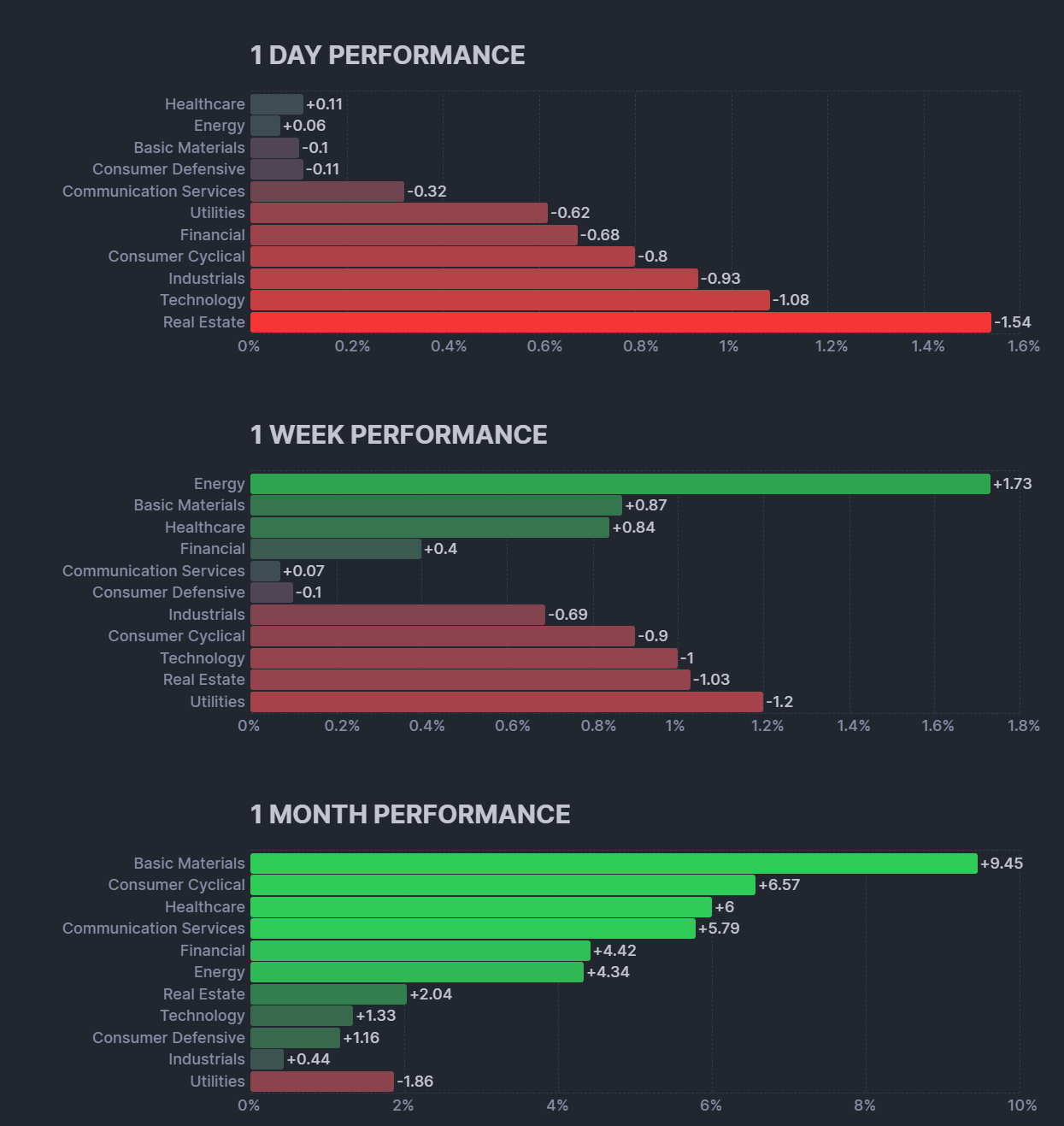 기술 섹터가 가장 큰 타격을 입었습니다. 금리 상승으로 인한 성장주 가치 평가 부담과 함께 대형 기술주들이 동반 하락했습니다. 반도체와 소프트웨어 주식들이 특히 큰 폭으로 하락했습니다.