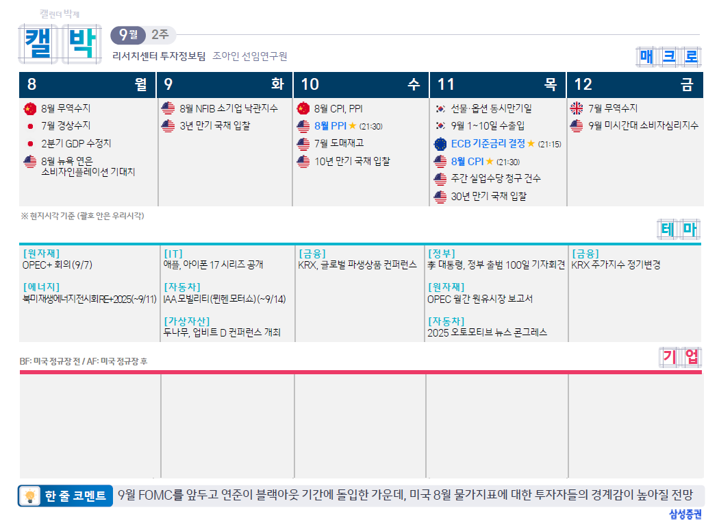 - 9월 11-13일: 연준 위원들 발언 집중 (윌리엄스, 쿡, 바킨 총재)
