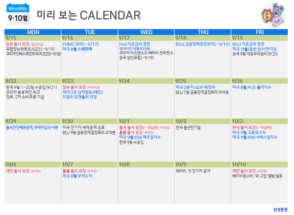 - 9월 18일: FOMC 정기회의 (25bp 금리인하 90% 확률)