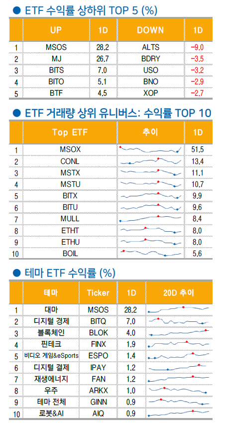 - 퀀텀스케이프 (QS -2.21%), 앨버말 (ALB -1.38%), 리튬아메리카 (LAC -9.32%): 2차전지 및 리튬 관련주는 부진.