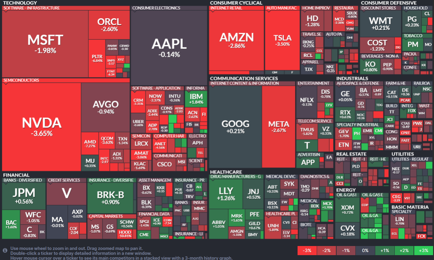 - Technology Select Sector SPDR Fund (XLK): -2.15% 하락. 엔비디아, AMD 등 주요 반도체 기업들의 부진과 AI 관련 소프트웨어 기업들의 고평가 우려가 섹터 전반을 끌어내렸습니다.