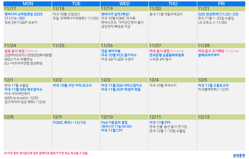 - 연말 소비 시즌: 연말 쇼핑 시즌의 소비 규모와 AI 관련 자본 지출이 시장의 주요 변수로 작용할 전망입니다.