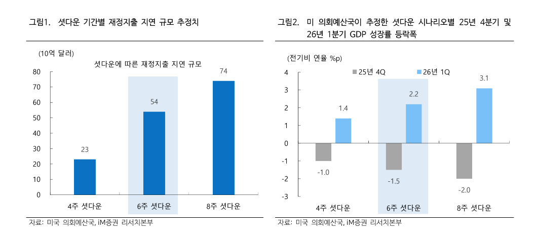 미국 의회예산국 자료에 따르면 6주 셧다운 시 4분기 미국 GDP성장률은 약 1.5%p(전기비연율 기준) 둔화될 것으로 추정되고 있다. 다만, 동 자료에 따르면 위축된 경제활동은 바로 복원이 될 것으로 내다봤다. 4분기 GDP 성장률 둔화의 반작용으로 내년 1분기 GDP성장률은 2.2%p(전기비 연율) 추가 상승할 것으로 전망하고 있다.