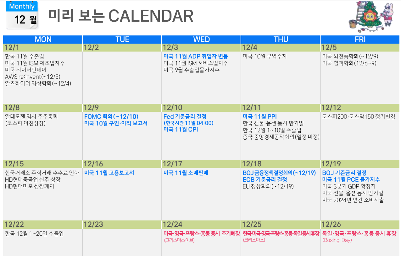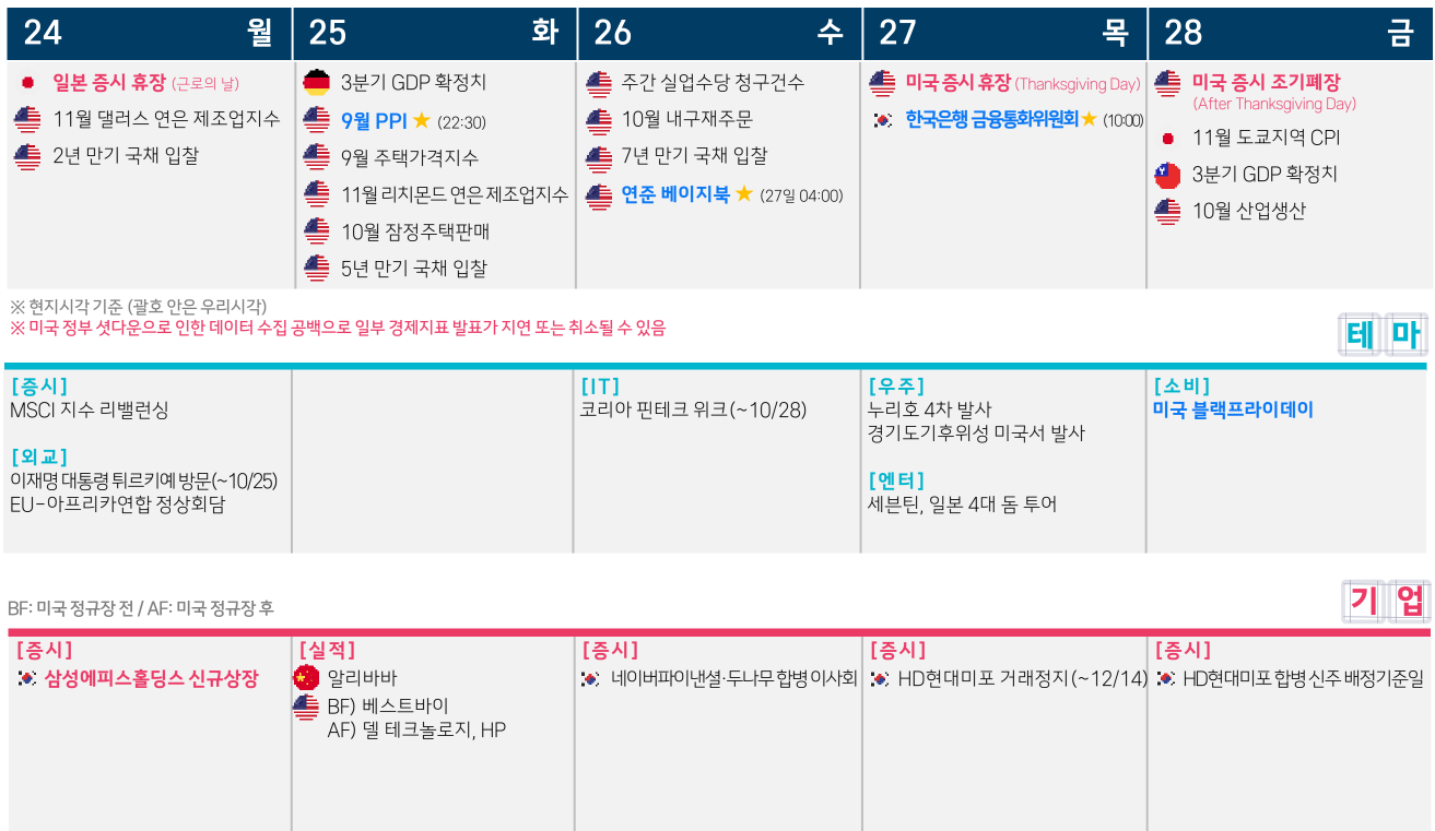 - 미국 소비 행태 및 물가 지표: 25일 소비자 신뢰지수, 26일 PCE 가격지수 및 개인소득/지출, 28일 블랙프라이데이 등을 통해 연준의 연착륙 시나리오와 소비 행태 변화를 확인할 수 있습니다.