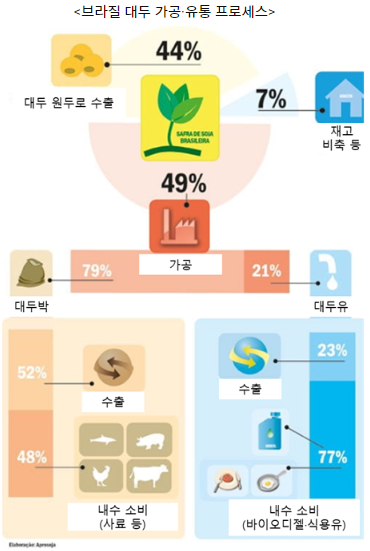 1. 브라질 대두콩은 중국, 유럽연합, 기타 아시아 국가(동남아·대한민국·일본) 등으로 많이 수출된다. ▲ 대두박은 아시아 국가(중국 외), 유럽연합, 중동으로 ▲대두유는 인도, 방글라데시, 미주, 아프리카, 중국 등으로 주로 선적된다. 중국 정부는 2022년 중반 브라질산 대두박 수입도 허용하였기에 2023년 이후 對중국 대두박 수출량도 대폭 증가할 것으로 예상된다.