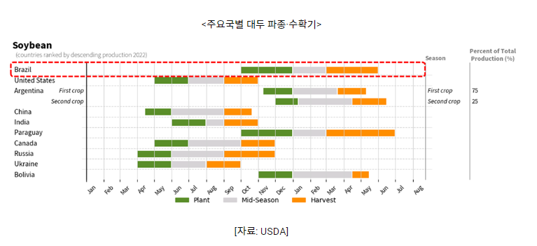 2. 남미 대륙에서는 파라과이와 볼리비아도 대두를 생산한다. 남미는 미국 등 북반구 국가와 대두 파종·수확 시기가 다르기 때문에 수출경합을 피할 수 있으며 판로 확보도 유리하다.