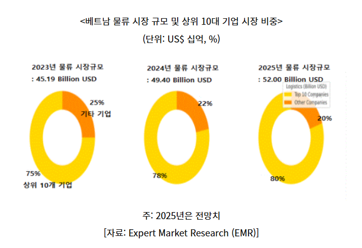 [시장 구조 측면에서는 상위 10대 기업이 전체 시장의 약 25% 내외를 차지]하며, 나머지 대부분은 다수의 중소 물류업체가 분담하는 형태입니다. 상위 10대 기업의 비중은 2023년 25%에서 2025년 20% 수준으로 감소할 것으로 예상되어, 시장 경쟁이 심화되고 다양한 중소·신규 기업의 참여가 확대되고 있음을 보여줍니다.